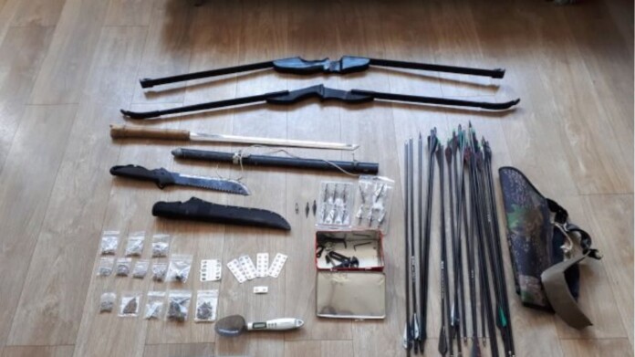 Όμως, και οι άνδρες της Δίωξης και του Κλιμακίου Ειδικών Αποστολών βρήκαν στο σπίτι ένα μικρό οπλοστάσιο που αποτελούνταν από ένα σπαθί με λάμα μήκους 62 εκατοστών με θήκη, δύο τόξα, 19 βέλη, 14 μεταλλικές μύτες βελών και ένα μαχαίρι με λάμα μήκους 30 εκατοστών! Ο 44χρονος συνελήφθη και οδηγήθηκε στον εισαγγελέα Πρωτοδικών Κέρκυρας με κατηγορίες για κατοχή ναρκωτικών και παράνομη οπλοκατοχή.