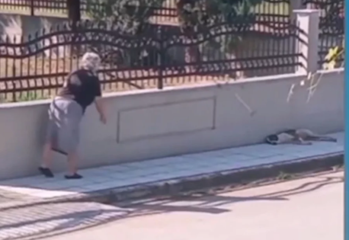 Το βίντεο, το οποίο κατέγραψε κάτοικος του χωριού Χρυσαυγή, στο δήμο Λαγκαδά, δείχνει την ηλικιωμένη γυναίκα να βαδίζει αργά με τη βοήθεια του μπαστουνιού της και βλέποντας το σκυλάκι να κάθεται σε ένα σκιερό μέρος στο πεζοδρόμιο, του πέταξε τη μεταλλική μαγκούρα.