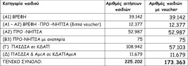 Σύμφωνα με τα οριστικά αποτελέσματα που αναγράφονται στον πίνακα που ακολουθεί, ο αριθμός των έγκυρων αιτήσεων των παιδιών ανήλθε σε 225.202 και λαμβάνουν voucher 173.363 παιδιά και ΑμεΑ.