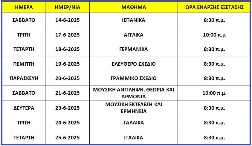 Πρόγραμμα Πανελληνίων 2025 Ειδικών και Μουσικών μαθημάτων ΓΕΛ