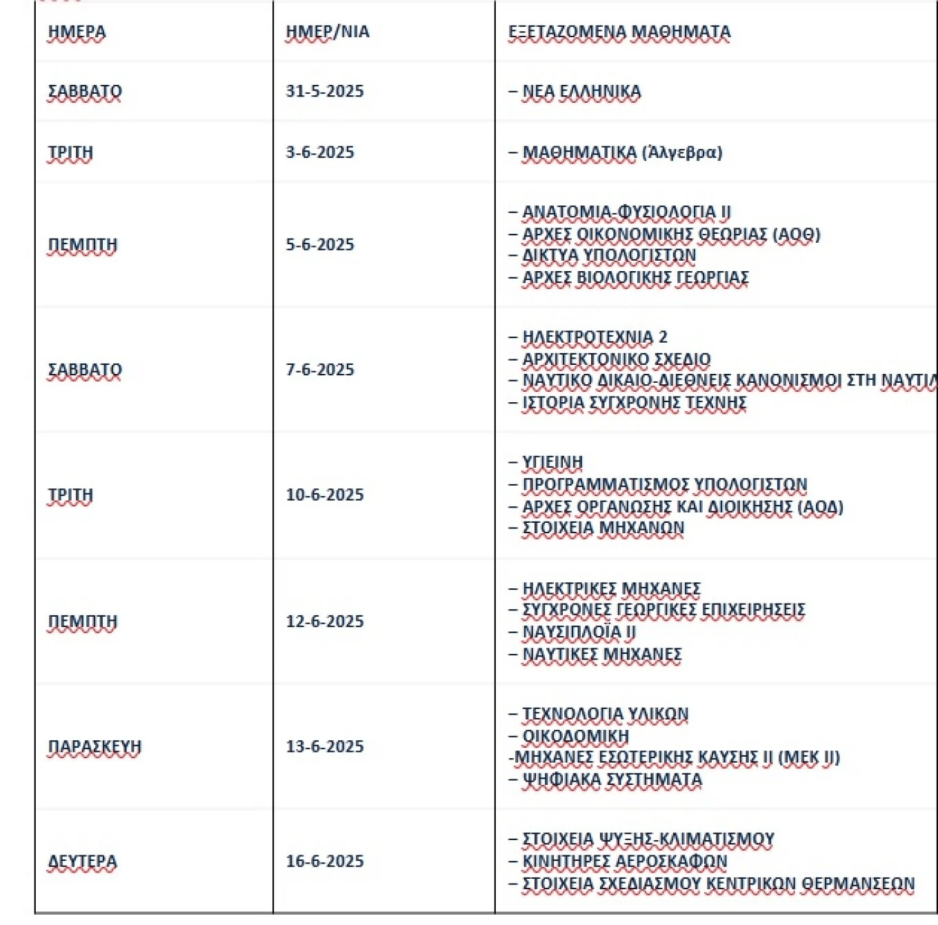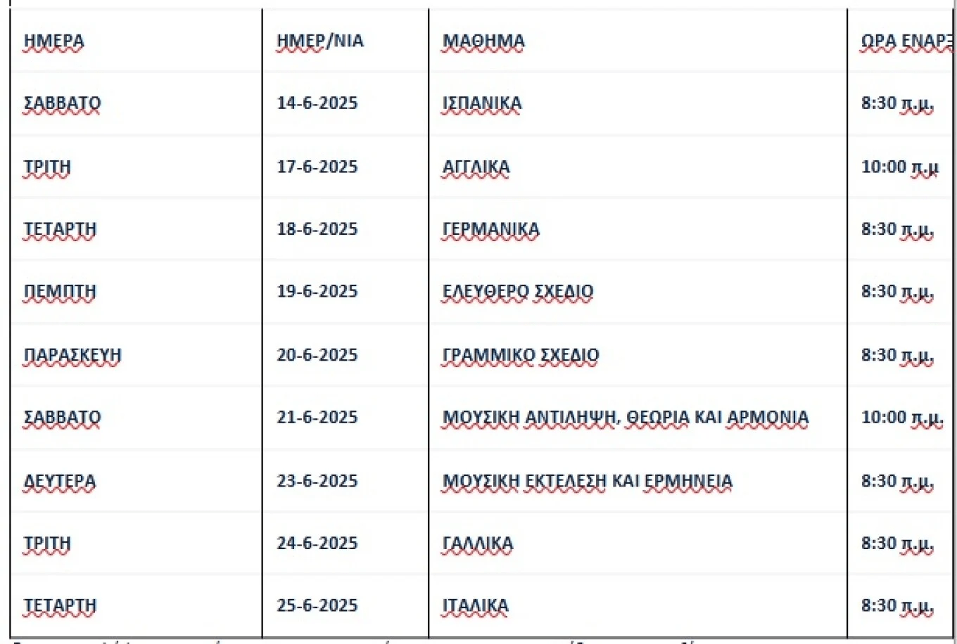 Οι εξετάσεις για τα ειδικά και μουσικά μαθήματα θα πραγματοποιηθούν βάσει του ακόλουθου προγράμματος: