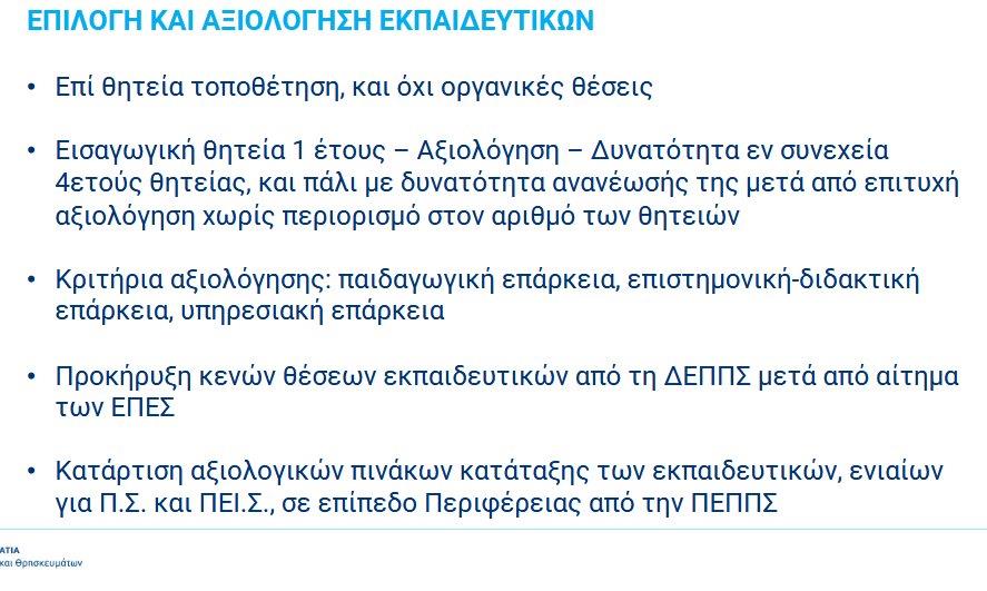 Στα κριτήρια αξιολόγησης προβλέπονται η παιδαγωγική επάρκεια, η επιστημονική και διδακτική επάρκεια και η υπηρεσιακή επάρκεια.