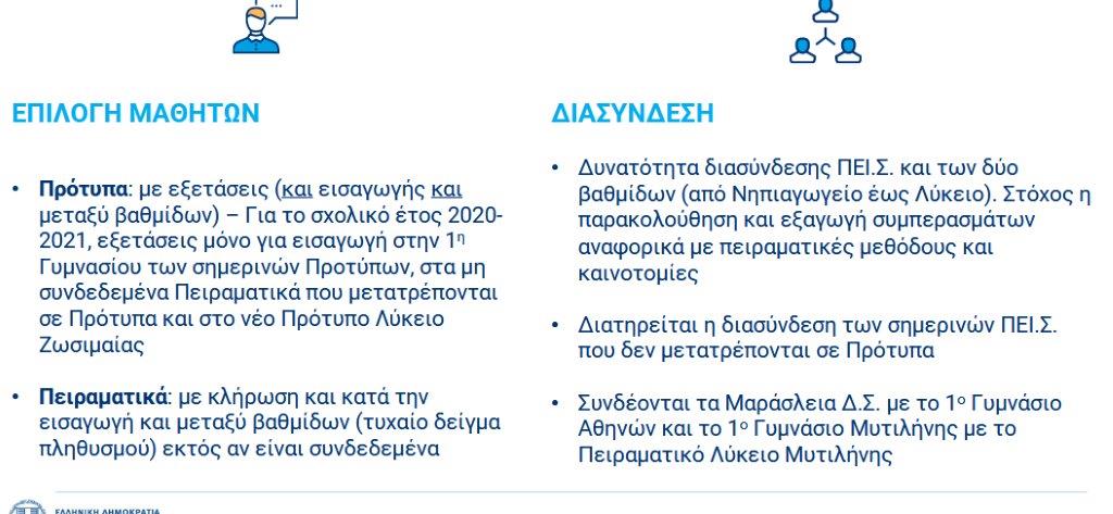 Καταρχάς για την επιλογή των μαθητών, η εγγραφή τους στα Πρότυπα Λύκεια θα γίνεται με εξετάσεις και εισαγωγικές αλλά και μεταξύ των βαθμίδων. Για το σχολικό έτος μάλιστα 2020-2021, εξετάσεις προβλέπονται μόνο για εισαγωγή στην 1η Γυμνασίου των σημερινών Προτύπων, στα μη συνδεδεμένα Πειραματικά που μετατρέπονται σε Πρότυπα και στο νέο Πρότυπο Λύκειο της Ζωσιμαίας.