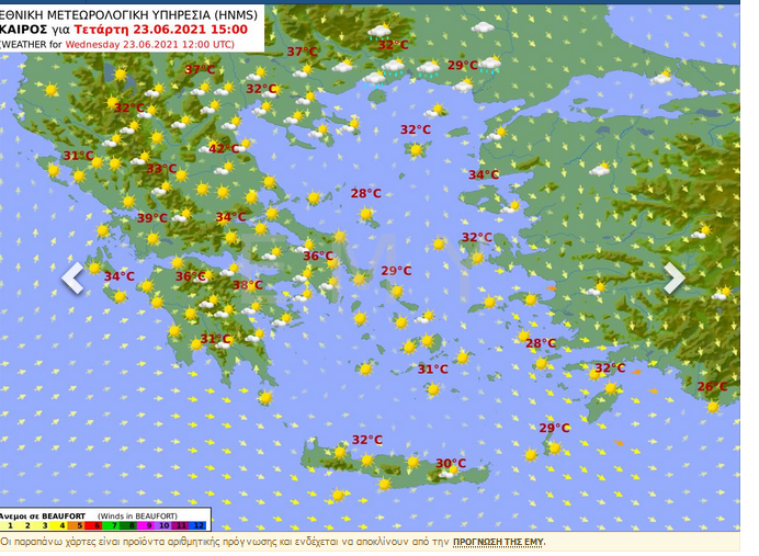 Η κορύφωση του κύματος ζέστης εκτιμάται μέσα στο τριήμερο Πέμπτης 24/6 – Σαββάτου 26/6, οπότε σε αρκετές περιοχές της χώρας θα επικρατήσουν συνθήκες καύσωνα, με τις μέγιστες να φτάνουν κατά τόπους τους 41-43 βαθμούς Κελσίου.