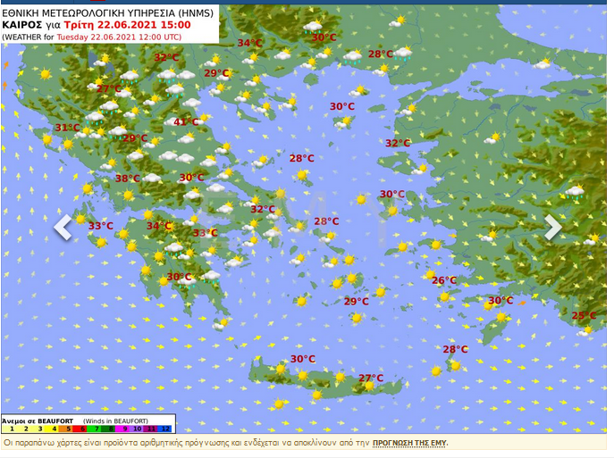 Γενικά αίθριος, με πρόσκαιρες νεφώσεις στα ηπειρωτικά τις μεσημβρινές και απογευματινές ώρες οπότε στα ορεινά είναι πιθανόν να εκδηλωθούν τοπικοί όμβροι ή μεμονωμένες καταιγίδες. Οι άνεμοι δυτικοί νοτιοδυτικοί 3 με 4 μποφόρ. Η θερμοκρασία από 19 έως 36 βαθμούς Κελσίου. Στα νησιά και στα παραθαλάσσια η μέγιστη 2 με 4 βαθμούς χαμηλότερη.