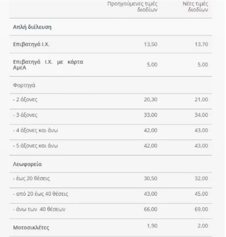 Αναλυτικά, οι τιμές όλων των διοδίων ανά σταθμό διοδίων και κατηγορία οχήματος διαμορφώνονται ως εξής:
