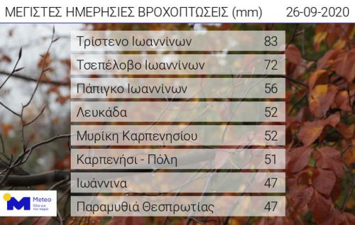 Σύμφωνα με το δίκτυο αυτόματων μετεωρολογικών σταθμών του Εθνικού Αστεροσκοπείου Αθηνών / Meteo.gr, τα μεγαλύτερα ύψη βροχής σημειώνονται στην Ήπειρο και το Κεντρικό Ιόνιο και συγκεκριμένα στις περιοχές του Πίνακα, ο οποίος ακολουθεί.