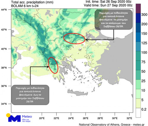 Τα φαινόμενα ενδέχεται να είναι κατά τόπους έντονα έως το μεσημέρι στη Δυτική Στερεά και στη Δυτική Πελοπόννησο, ενώ κυρίως τις μεσημεριανές ώρες στη Μακεδονία, στη Θράκη και στα νησιά του Βορείου Αιγαίου, όπου υπάρχει πιθανότητα τοπικών χαλαζοπτώσεων. Στο Χάρτη 1 που ακολουθεί, παρουσιάζονται τα εκτιμώμενα ημερήσια ύψη βροχής, καθώς επίσης και οι περιοχές όπου υπάρχει πιθανότητα για τοπικά έντονα φαινόμενα.