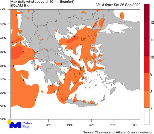 Παράλληλα, θα επικρατήσουν ισχυροί άνεμοι δυτικών διευθύνσεων στο Ιόνιο και νοτίων διευθύνσεων στο Αιγαίο, με τις εντάσεις τους να φτάνουν τα 7 μποφόρ, ενώ μετά το μεσημέρι οι άνεμοι στο Αιγαίο θα στραφούν σε δυτικούς με την έντασή τους στο Βόρειο Αιγαίο να φτάνει πρόσκαιρα τα 8 μποφόρ (Χάρτης 2).
