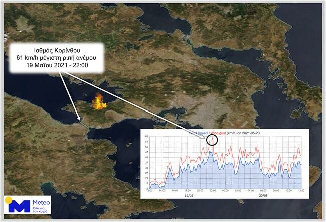 Λαμβάνοντας υπόψη ότι ο πλησιέστερος στην πυρκαγιά αυτόματος μετεωρολογικός σταθμός βρίσκεται στον Ισθμό, δε θα πρέπει να αποκλειστεί η παρουσία ισχυρότερων ανέμων στην περιοχή της πυρκαγιάς, εξαιτίας και της πυρκαγιάς καθώς «η φωτιά δημιουργεί το δικό της καιρό».
