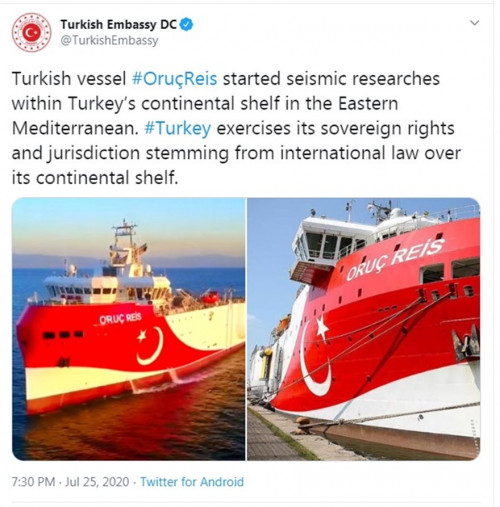 «Το τουρκικό πλοίο Oruc Reis ξεκίνησε σεισμικές έρευνες εντός της τουρκικής υφαλοκρηπίδας στην Ανατολική Μεσόγειο», σημείωναν οι διαχειριστές της επίσημης σελίδας «Η Τουρκία ασκεί τα κυριαρχικά της δικαιώματα όπως αυτά προκύπτουν από το Διεθνές Δίκαιο».