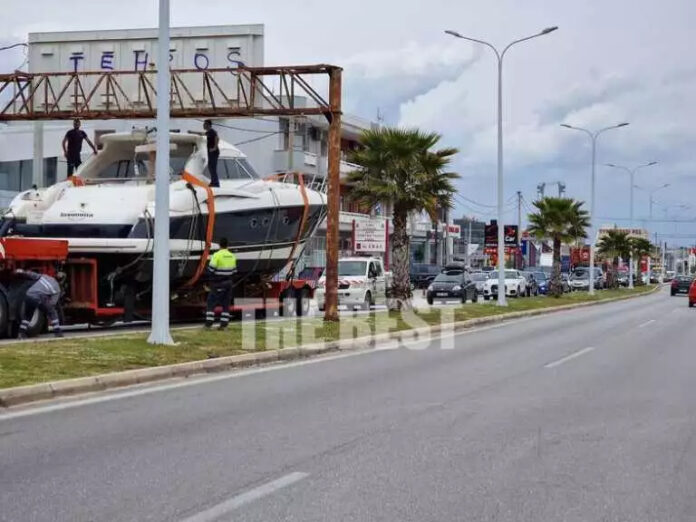 Το ραντάρ-κεραία που είχε το ρυμουλκούμενο σκάφος «βρήκε» πάνω στην ταμπέλα του δρόμου, η κυκλοφορία σταμάτησε και πολλά αυτοκίνητα παρέμειναν ακινητοποιημένα.