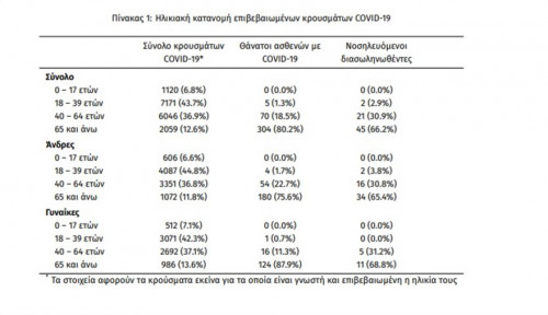 Το υψηλότερο ποσοστό των κρουσμάτων (43,7%) ανήκει πλέον στην ηλιακή ομάδα 18-39, ενώ ακολουθεί η ηλικιακή ομάδα 40-64 έτη (36,9%). Σύμφωνα με τον λοιμωξιολόγο Χαράλαμπο Γώγο τον οποίο επικαλείται ο ΣΚΑΪ, 4 στους 10 ασθενείς που νοσηλεύονται στην εντατική είναι κάτω των 65 ετών.