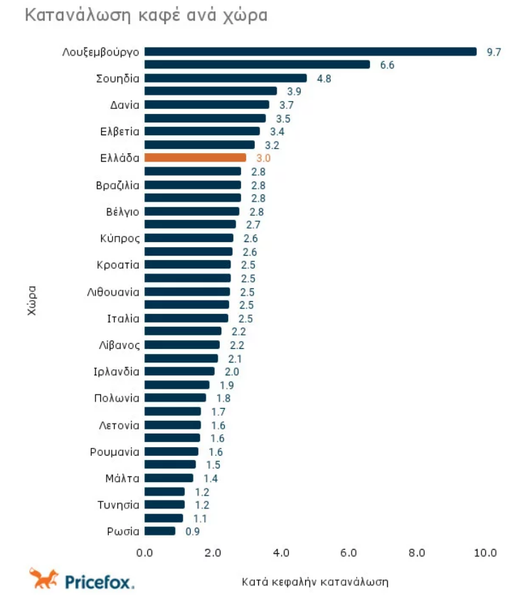 Οι Έλληνες μπαίνουν στην κορυφαία δεκάδα με 3 κιλά καφέ κατά κεφαλήν ετήσια κατανάλωση. Ενώ η Ιταλία που είναι γνωστή για την εκλεπτυσμένη κουλτούρα της στον καφέ βρίσκεται στην 21η θέση στην κατάταξη με μόλις 2,5 κιλά καφέ κατα κεφαλήν.