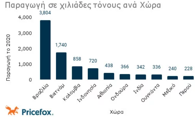 Η Βραζιλία είναι με διαφορά η χώρα με τη μεγαλύτερη παραγωγή ξεπερνώντας της επόμενες τέσσερις μαζί με ετήσια παραγωγή 3,804 χιλιάδων τόνων και με σχεδόν το 38% της αγοράς. Το Βιετνάμ, η Κολομβία και η Ινδονησία είναι οι επόμενες τρεις μεγάλες χώρες-παραγωγοί με 3,318 χιλιάδες τόνους παραγωγής ετησίως.