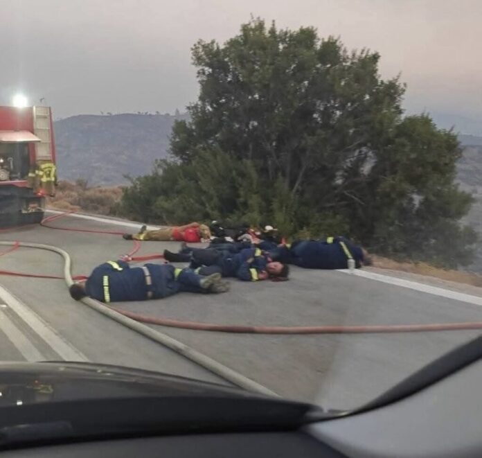 Η σελίδα Fire Fighting Greece δημοσίευσε το στιγμιότυπο, το οποίο δείχνει τους πυροσβέστες να παίρνουν ανάσα μετά από ώρες αδιάκοπης προσπάθειας στην πρώτη γραμμή. Οι καταστροφές από τη φωτιά στο νησί είναι τεράστιες, ενώ οι πυροσβέστες συνεχίζουν τις επιχειρήσεις τους με αυταπάρνηση, παρά την εξάντληση και τον κίνδυνο.