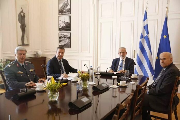 Στη σύσκεψη συμμετείχαν ο υπουργός Επικρατείας, Βασίλειος Σκουρής, ο υπουργός Προστασίας του Πολίτη, Χαράλαμπος Λαλούσης, και ο αρχηγός της αστυνομίας Λάζαρος Μαυρόπουλος.