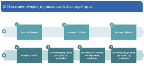 Αναφερόμενος στα «τρία στάδια “εξόδου” από την κρίση προς την νέα καθημερινότητα» ο yφυπουργός παρά τω Πρωθυπουργώ, αρμόδιος για το Συντονισμό του Κυβερνητικού Έργου Άκης Σκέρτσος, ανέφερε ως κομβικές ημερομηνίες την 4η, 11η και 18η Μαΐου, ενώ το πλάνο του Ιουνίου θα ανακοινωθεί μετά τις 18 Μαΐου.