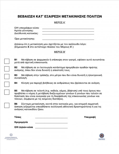 Για τις υπόλοιπες μετακινήσεις που εξαιρούνται: Για τις άλλες περιπτώσεις (μετάβαση σε σούπερ μάρκετ, φαρμακείο, τράπεζα κοκ) και για κάθε μεμονωμένη κίνηση οι πολίτες πρέπει να συμπληρώνουν κάθε φορά τη βεβαίωση τύπου Β με το ονοματεπώνυμο, τον τόπο κατοικίας και τον τόπο προορισμού του πολίτη, καθώς και τον συγκεκριμένο λόγο της μετακίνησης.