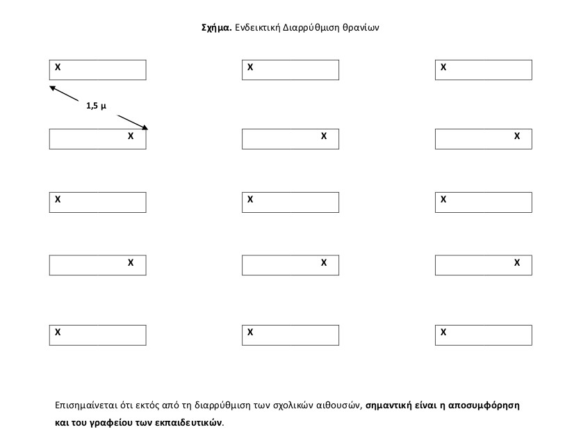 Σύμφωνα με την εγκύκλιο, οι σχολικές αίθουσες πρέπει να διαμορφωθούν έτσι ώστε να μεγιστοποιείται η απόσταση μεταξύ των μαθητών στο πλαίσιο του εφικτού, δηλαδή ένας μαθητής ανά θρανίο.