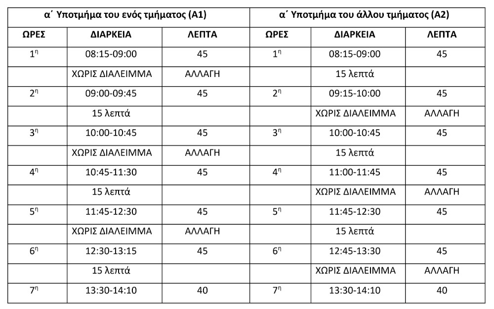 Υπενθυμίζεται, ότι ο μέγιστος επιτρεπόμενος αριθμός μαθητών ανά σχολική αίθουσα ορίζεται στους 15. Υπάρχει η δυνατότητα αναπροσαρμογής των ωρολογίων προγραμμάτων ανά υποτμήμα, ώστε το ήδη υφιστάμενο εκπαιδευτικό προσωπικό να αξιοποιείται με τον βέλτιστο δυνατό τρόπο ανά υποτμήμα και διδακτική ώρα.