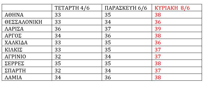 «Το κύμα αυτό ζέστης αναμένεται να έχει εξάρσεις ,ενώ η διάρκειά του φαίνεται να προσεγγίζει και τη δεύτερη εβδομάδα του Ιουνίου. Προσοχή στον αυξημένο κίνδυνο πυρκαγιάς! Ενδεικτικά η πορεία της θερμοκρασίας σε 10 πόλεις φαίνεται στον παρακάτω πίνακα καθώς και το φαινόμενο του “θερμικού θόλου ” στις εικόνες που ακολουθούν!», καταλήγει.