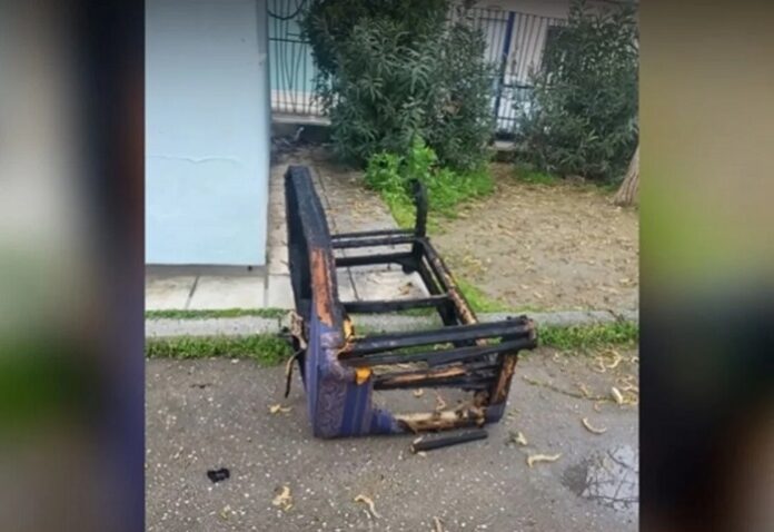 Οι δράστες παράτησαν τον καναπέ μέσα στην αυλή του σχολείου, έβαλαν τη φωτιά και εξαφανίστηκαν.