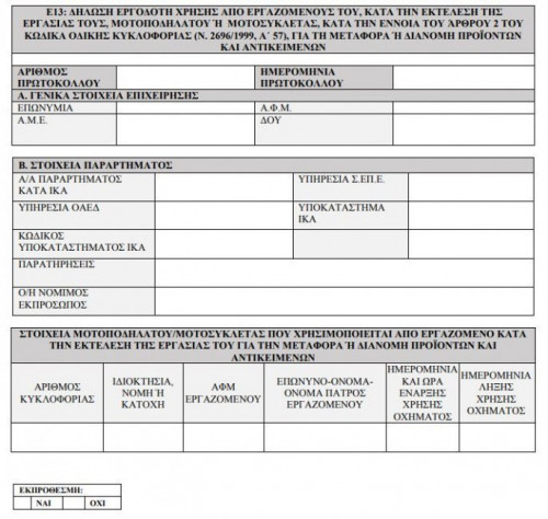 Με το νέο έντυπο Ε13, οι εργοδότες υποχρεούνται να προδηλώνουν την χρήση της μοτοσικλέτας από τον εργαζόμενο πριν την έναρξη της εργασίας για τη μεταφορά ή διανομή προϊόντων και αντικειμένων. Αντίστοιχα καταχωρείται η λήξη της χρήσης της μοτοσικλέτας, εφόσον αυτή δεν χρησιμοποιείται πια για τις ανάγκες των εργασιών της επιχείρησης. =