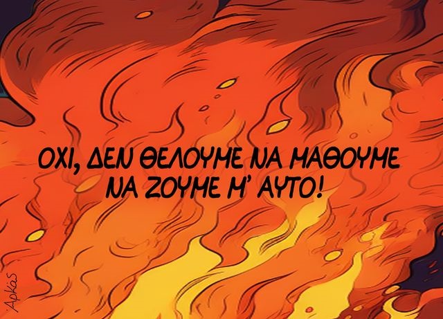 «Όχι δεν θέλουμε να μάθουμε να ζούμε μ’ αυτό» γράφει με μαύρα γράμματα πάνω σε φλόγες, ο Αρκάς.