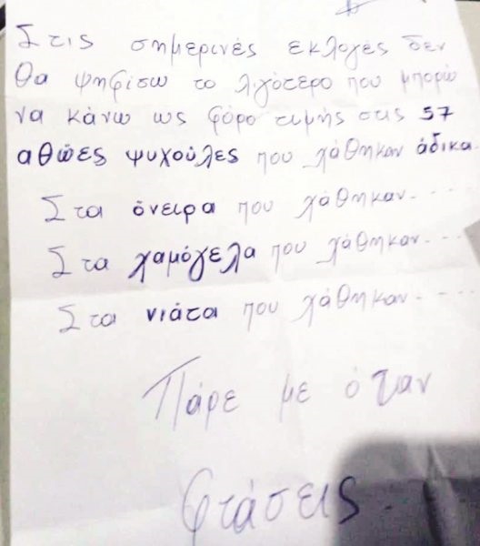 «Στις σημερινές εκλογές δε θα ψηφίσω, το λιγότερο που μπορώ να κάνω ως φόρο τιμής στις 57 αθώες ψυχούλες που χάθηκαν άδικα. Στα όνειρα που χάθηκαν, στα χαμόγελα που χάθηκαν, στα νιάτα που χάθηκαν. Πάρε με όταν φτάσεις…».