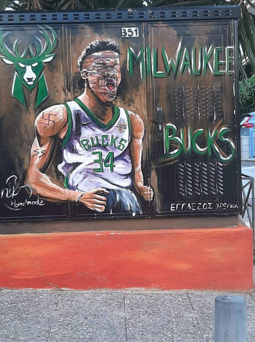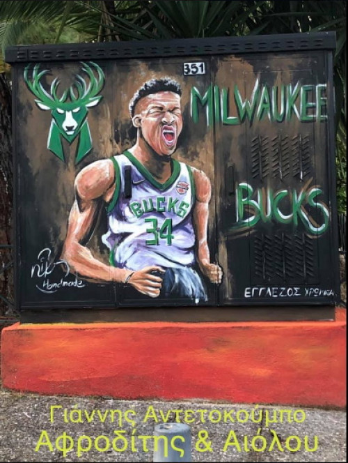 Ο «Greek Freak» εμφανίζεται την φανέλα των Μπακς στο γκράφιτι και το όνομά του είναι γραμμένο με γαλανόλευκα χρώματα.