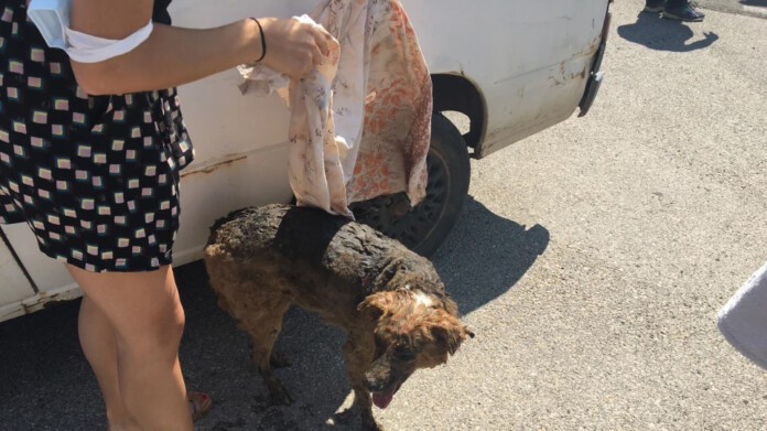 Πολύ συγκινητικές είναι οι φωτογραφίες με τους κατοίκους να δείχνουν φροντίδα και αγάπη στον σκύλο, τις κρίσιμες ώρες της φωτιάς