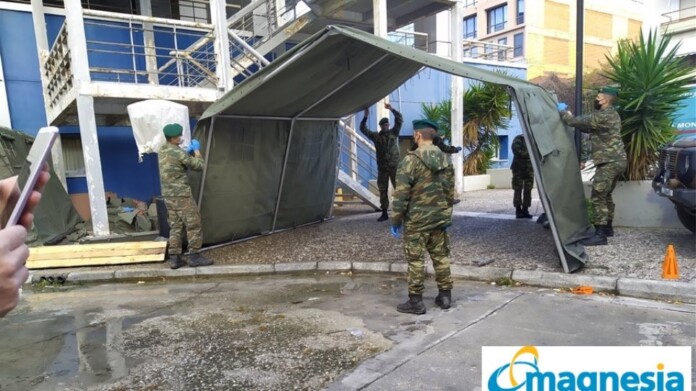Στρατιωτικές σκηνές στο προαύλιο του νοσοκομείου Βόλου έστησαν από νωρίς το πρωί κλιμάκιο του στρατού και της Ταξιαρχίας Πεζοναυτών.