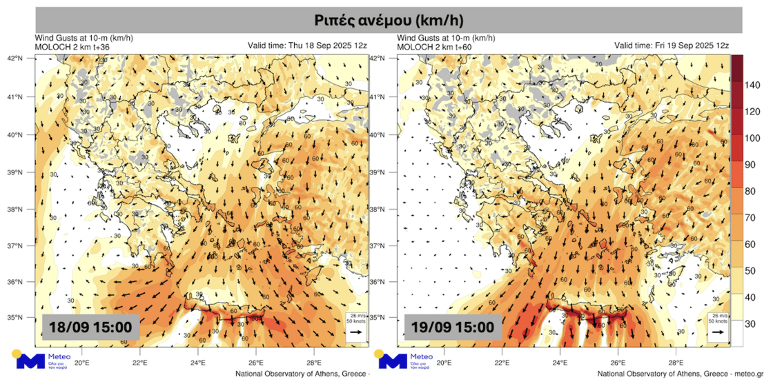 Όπως χαρακτηριστικά αναφέρεται τόσο σήμερα όσο και αύριο, οι άνεμοι θα πνέουν με εντάσεις έως 6-7 μποφόρ και τοπικά πιθανώς έως 8 μποφόρ, ενώ οι ριπές του ανέμου αναμένεται να ξεπεράσουν κατά τόπους τα 70-80 χιλιόμετρα ανά ώρα.