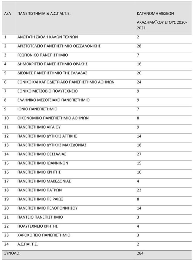 Υπεγράφη από την υπουργό Παιδείας και Θρησκευμάτων, Νίκη Κεραμέως, η απόφαση με την οποία κατανέμονται 282 θέσεις για πρόσληψη διδασκόντων του Π.Δ. 407/80 στα Πανεπιστήμια και δύο θέσεις για πρόσληψη ωρομίσθιων εκπαιδευτικών στην Α.Σ.ΠΑΙ.Τ.Ε. για το ακαδημαϊκό έτος 2020 -2021.