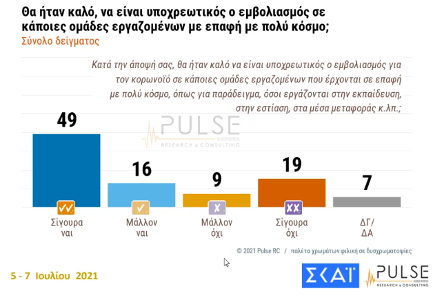 Αναλυτικά, στην ερώτηση για το αν θα ήταν καλό να είναι υποχρεωτικός ο εμβολιασμός σε κάποιες ομάδες εργαζομένων, σχεδόν οι μισοί (49%) απάντησαν «σίγουρα ναι», το 16% «μάλλον ναι», το 19% «σίγουρα όχι», το 9% «μάλλον όχι», ενώ το 7% δήλωσε «δεν γνωρίζω/δεν απαντώ».