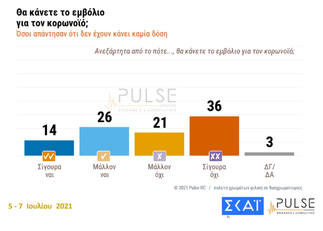 Ωστόσο, ανησυχητικά είναι τα στοιχεία σε σχέση με την πρόθεση εμβολιασμού των ερωτηθέντων από εκείνους που απάντησα ότι δεν έχουν κάνει καμία δόση. Σύμφωνα με αυτά το 57% δηλώνει ότι δεν θα το κάνει («σίγουρα όχι» 36%, «μάλλον όχι» 21%) έναντι 40% που δηλώνει ότι θα κάνει το εμβόλιο (26% «μάλλον ναι» και 14% «σίγουρα ναι»).
