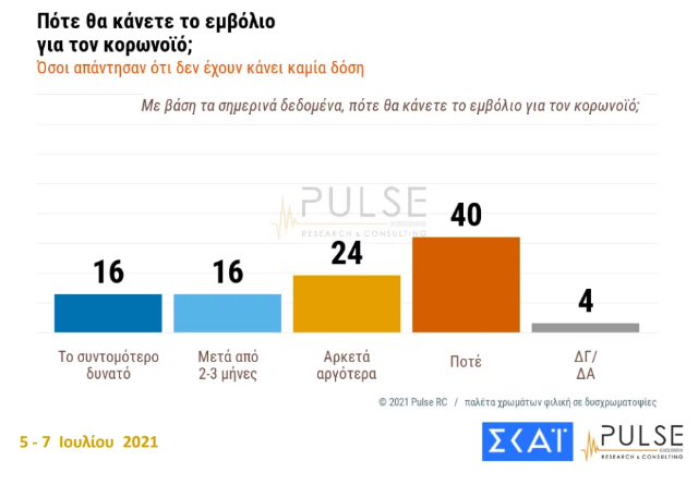 Επίσης στην ίδια κατηγορία, σε όσους δηλαδή δεν έχουν κάνει καμία δόση εμβολίου, στην ερώτηση «πότε θα κάνετε το εμβόλιο για τον κορωνοϊό», το 40% απαντά ότι δεν θα κάνει «ποτέ» το εμβόλιο, το 24% απαντά ότι θα το κάνει «αρκετά αργότερα», το 16% «μετά από 2-3 μήνες» και το 16% το «συντομότερο δυνατόν».