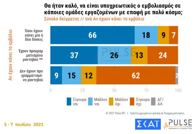 Σύμφωνα με τη δημοσκόπηση, αναφανδόν υπέρ του υποχρεωτικού εμβολιασμού κατά του κορωνοϊού για ομάδες εργαζομένων που έρχονται σε επαφή με πολύ κόσμο, όπως για παράδειγμα όσοι εργάζονται στην εκπαίδευση, την εστίαση και τα μέσα μαζικής μεταφοράς.