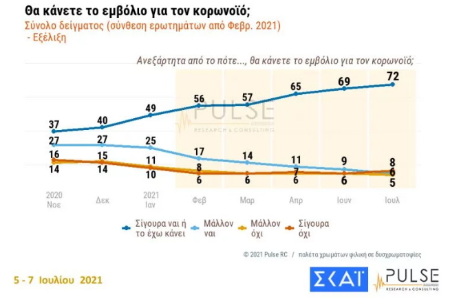 Ειδικότερα, υπέρ του εμβολιασμού κατά του κορωνοϊού τάσσονται περισσότεροι από 7 στους 10 Έλληνες. Σύμφωνα με τη δημοσκόπηση ενθαρρυντικό είναι το γεγονός ότι ανεξαρτήτως από το πότε θα κάνουν το εμβόλιο, το ποσοστό που έβλεπε με επιφυλακτικότητα τα εμβόλια μειώθηκε σημαντικά σε σχέση με το προηγούμενο διάστημα. Αναλυτικά, το 72% του δείγματος απάντησε ότι θα εμβολιαστεί έναντι 37% τον Νοέμβριο του 2020, 40% τον Δεκέμβριο του 2020, 49% τον Ιανουάριο του 2021, 56% τον Φεβρουάριο, 57% τον Μάρτιο, 65% τον Απρίλιο και 69% τον Ιούνιο.