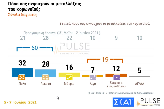 Σε ό,τι αφορά στην ανησυχία που προκαλούν οι μεταλλάξεις του κορωνοϊού, το 60% των ερωτηθέντων σημειώνει ότι ανησυχούν «πολύ» ή «αρκετά», σε αντίθεση με το 19%, που δηλώνει ότι ανησυχεί «από λίγο έως καθόλου».