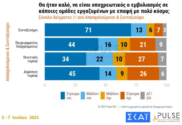Από τα στοιχεία που παρουσιάστηκαν ανά απασχόληση προκύπτει ότι υπέρ της υποχρεωτικότητας του εμβολιασμού τίθενται με συντριπτική πλειοψηφία (71%) οι συνταξιούχοι, ενώ ακολουθούν οι εργαζόμενοι στον δημόσιο τομέα σε ποσοστό 45%, οι επιχειρηματίες με 44% και ο ιδιωτικός τομέας με 34%.