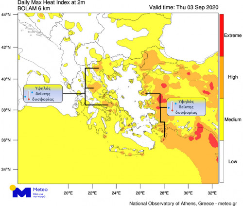 Βαθμός δείκτη δυσφορίας με χρωματική κλίμακα (λευκό: χαμηλός, κίτρινο: μέτριος, πορτοκαλί: υψηλός, κόκκινος: ακραίος), όπως υπολογίζεται από το αριθμητικό μοντέλο πρόγνωσης καιρού του Εθνικού Αστεροσκοπείου Αθηνών / Meteo.gr, για σήμερα