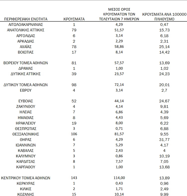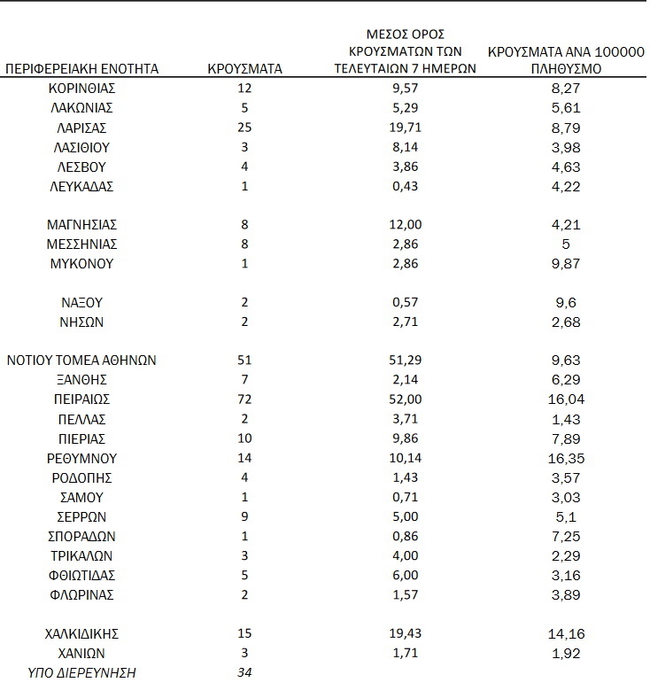 Αναλυτικά η κατανομή των κρουσμάτων σύμφωνα με τα στοιχεία που δημοσιοποίησε ο ΕΟΔΥ