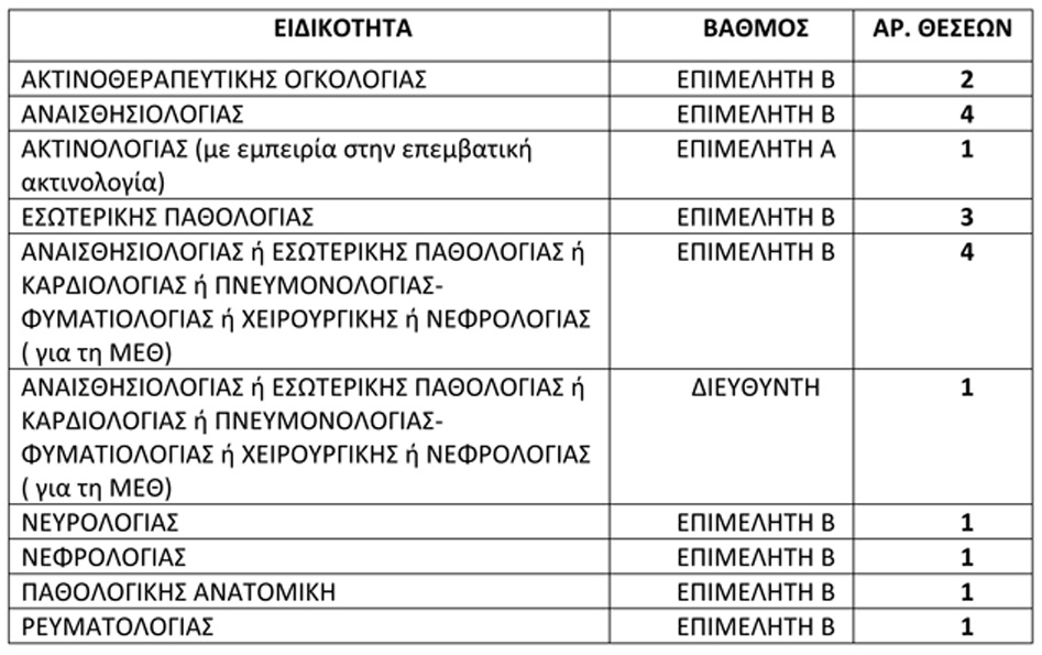 Με την αριθμ. 3038/09-02-2021 απόφαση προκήρυξης του Διοικητή του Πανεπιστημιακού Γενικού Νοσοκομείου Ιωαννίνων, που εκδόθηκε ύστερα από την αριθμ. πρωτ. Γ4α/Γ.Π. 5333/05-02-2021 εγκριτική απόφαση του Αναπληρωτή Υπουργού Υγείας, στο πλαίσιο της ενίσχυσης του Νοσοκομείου μας με ιατρικό προσωπικό, για την αποτελεσματικότερη λειτουργία της Ιατρικής Υπηρεσίας, ιδιαίτερα την κρίσιμη αυτή περίοδο, προκηρύχθηκαν οι παρακάτω δεκαεννέα (19) κενές οργανικές θέσεις ειδικευμένων ιατρών του κλάδου ΕΣΥ επί θητεία: