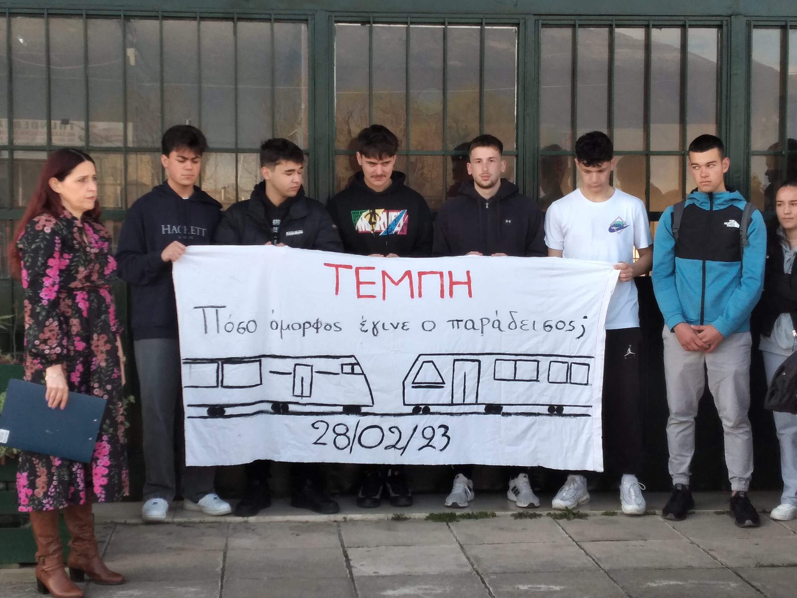 Λίγο πριν τις 10 το πρωί, οι μαθητές του σχολείου και οι καθηγητές συναντήθηκαν στην είσοδο του σχολείου όπου ανήρτησαν ένα πανό με ένα σκίτσο και την ημερομηνία του δυστυχήματος με δύο τρένα να συγκρούονται μετωπικά και το ερώτημα «Πόσο όμορφος έγινε ο παράδεισος;».