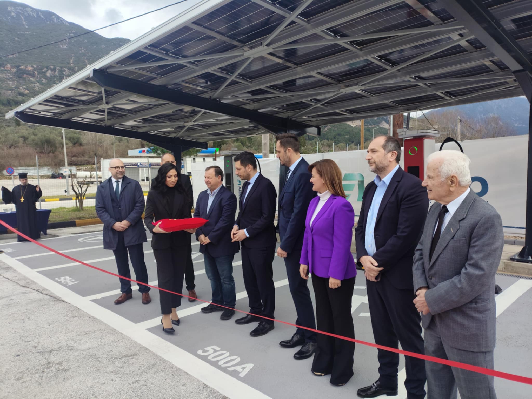 Παρουσία εκπροσώπων των βουλευτών της κυβέρνησης Μαρίας Κεφάλα και Βασίλη Γιόγιακα, εκπροσώπων της τοπικής αυτοδιοίκησης, στελεχών της αγοράς ενέργειας και της ηλεκτροκίνησης, και άλλων φορέων, ο αναπληρωτής υπουργός μετά τον αγιασμό έκοψε μαζί με τον ιδρυτή και Διευθύνοντα Σύμβουλο της Alesco κ. Σταύρο Αλέξη την κορδέλα παραδίδοντας τον σταθμό σε χρήση.