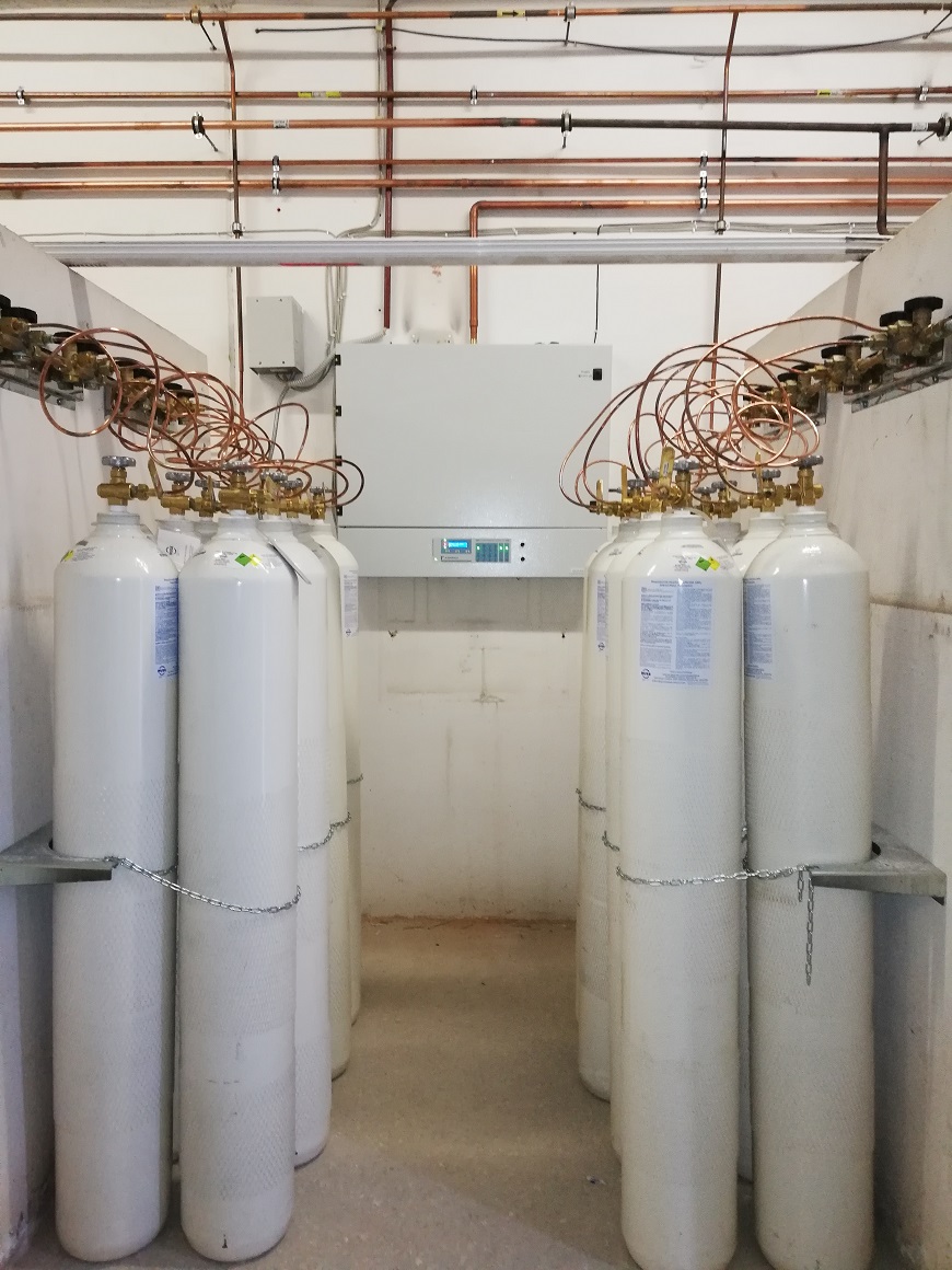 Νέο ανεξάρτητο δίκτυο προς την μονάδα Λοιμωδών (ΜΕΛ1) για διπλάσια ικανότητα παροχής οξυγόνου. - Εγκατάσταση διπλής συστοιχίας συστημάτων υποβιβασμού πίεσης από δεξαμενή υγρού οξυγόνου.