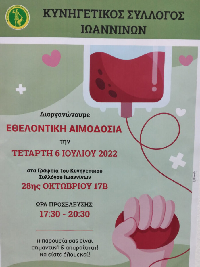 Ανοιχτή εθελοντική αιμοδοσία θα διεξαχθεί την Τετάρτη 6 Ιουλίου στα γραφεία του Κυνηγετικού Συλλόγου Ιωαννίνων