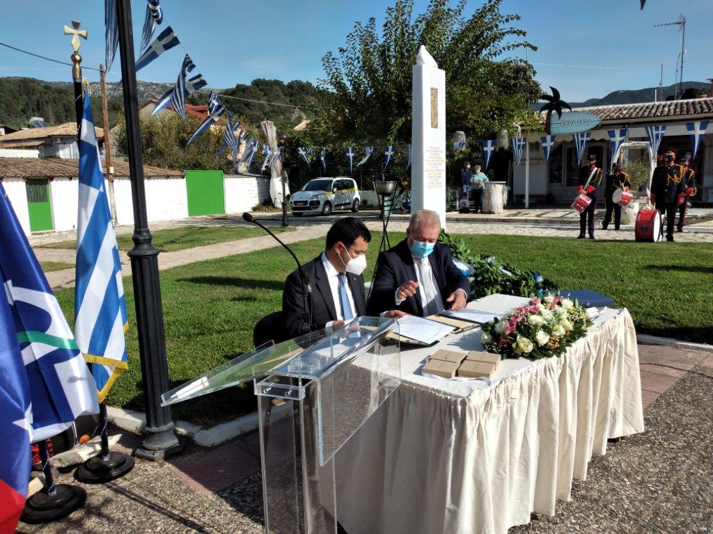 Μετά τα αποκαλυπτήρια και την κατάθεση στεφάνων, ακολούθησε η υπογραφή του πρωτοκόλλου αδελφοποίησης των δήμων Ηγουμενίτσας και Ύδρας και η ανταλλαγή αναμνηστικών δώρων.